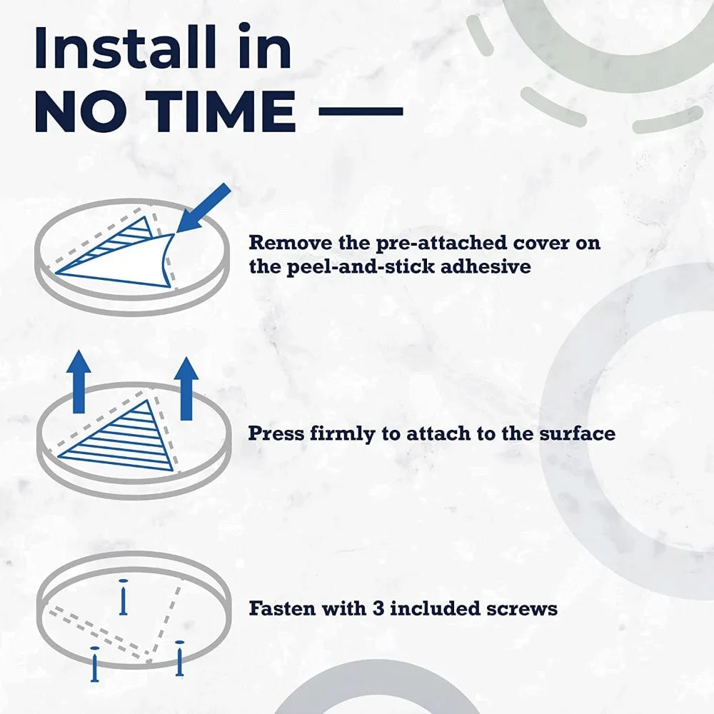 Easy Installation1. Remove the adhesive cover 2. Press firmly to affix to surface 3. Fasten with screws (included) |