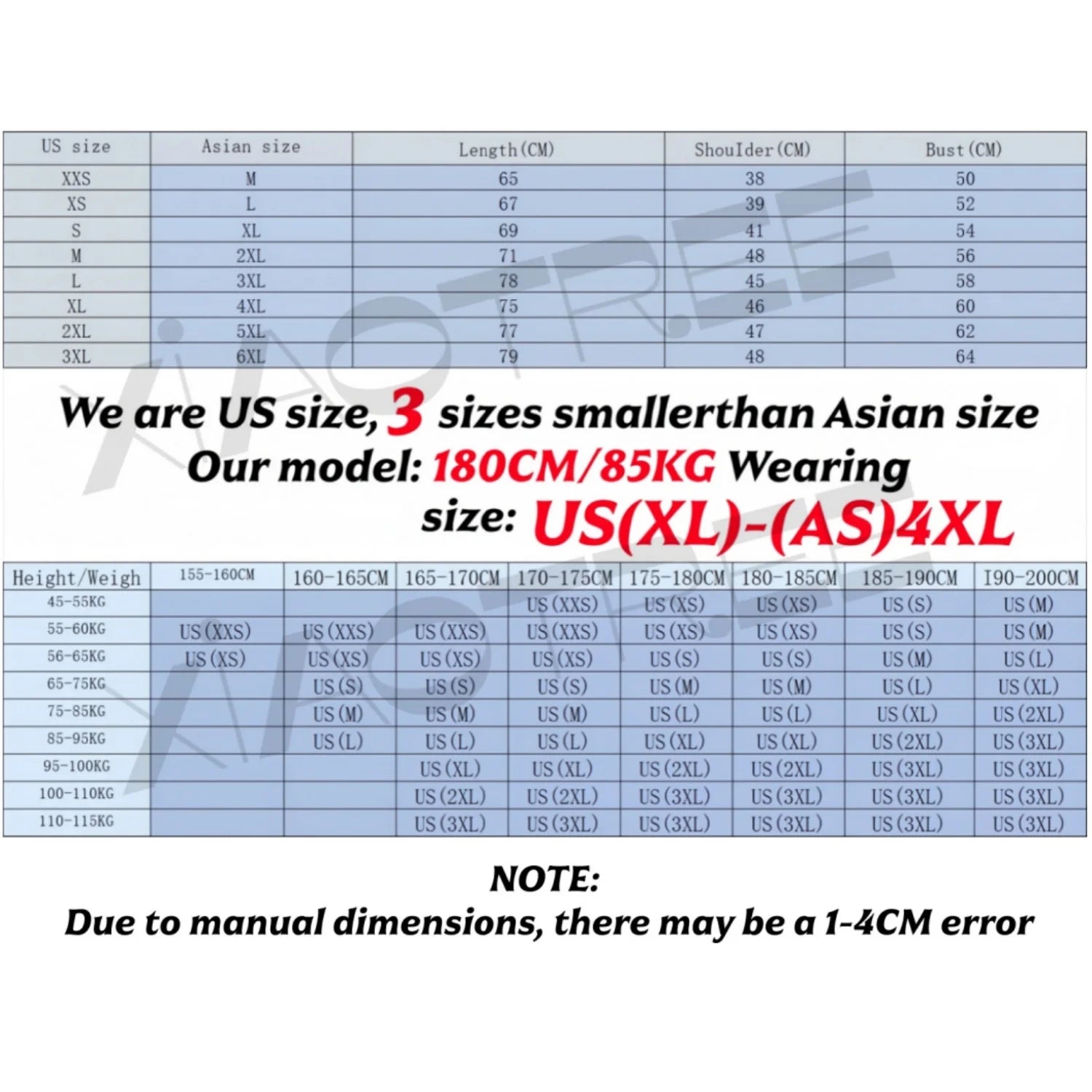 US Size XL = Asian Size 4XL