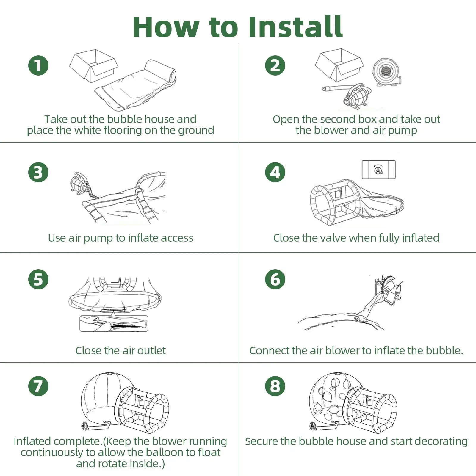 - Setup is fast—inflate the tunnel in minutes, seal, then inflate the bubble while the blower runs, delivering a dramatic, crystal-clear tent in under five minutes.