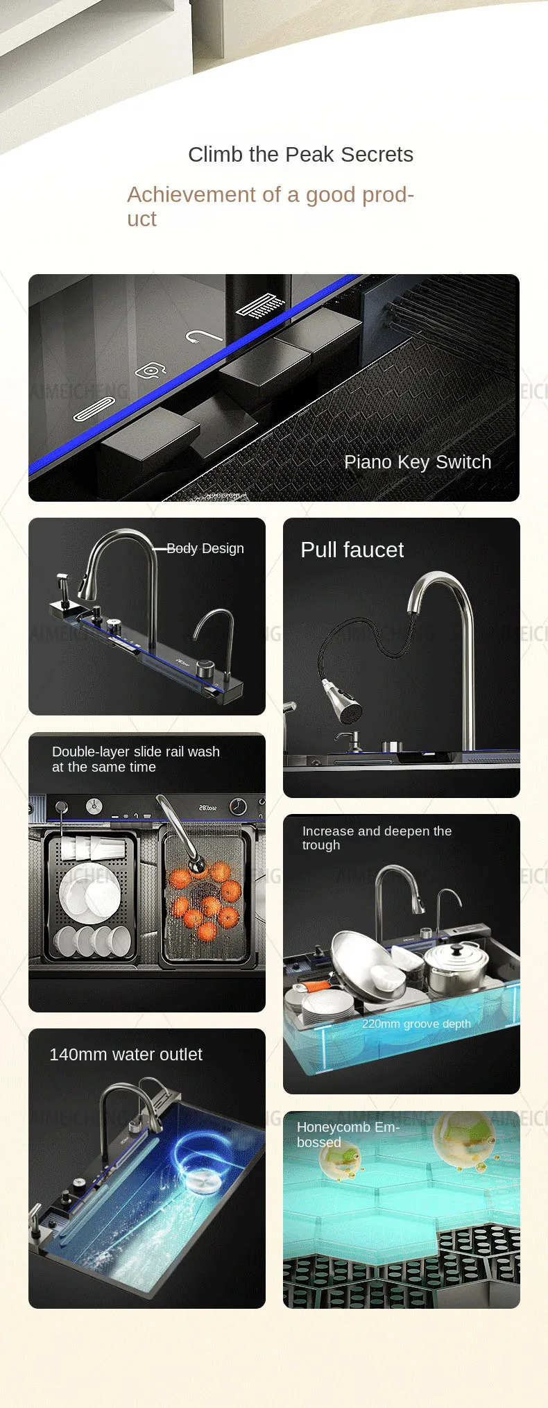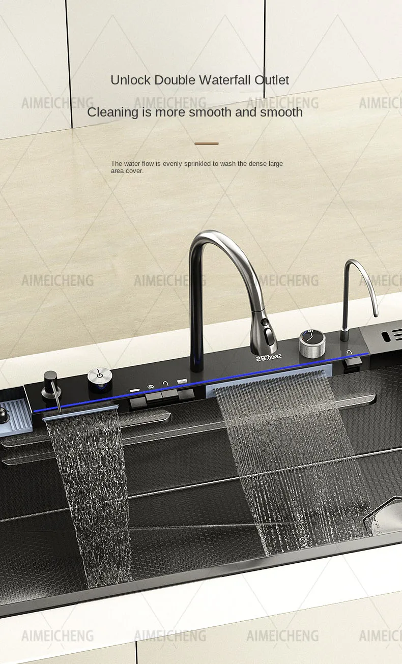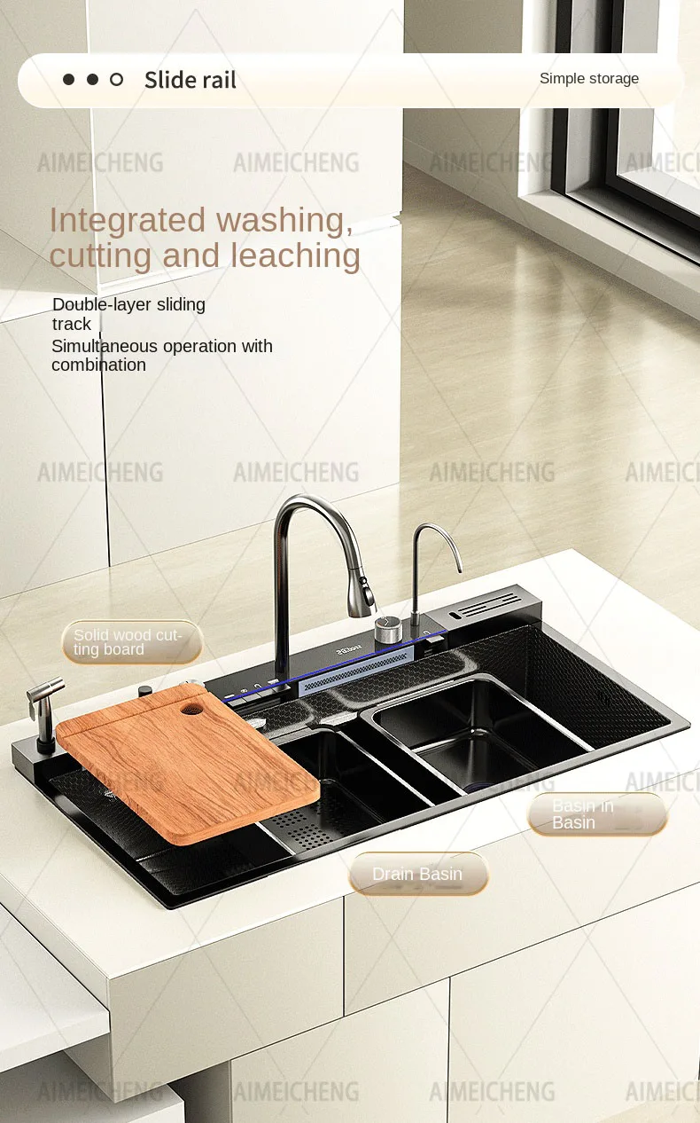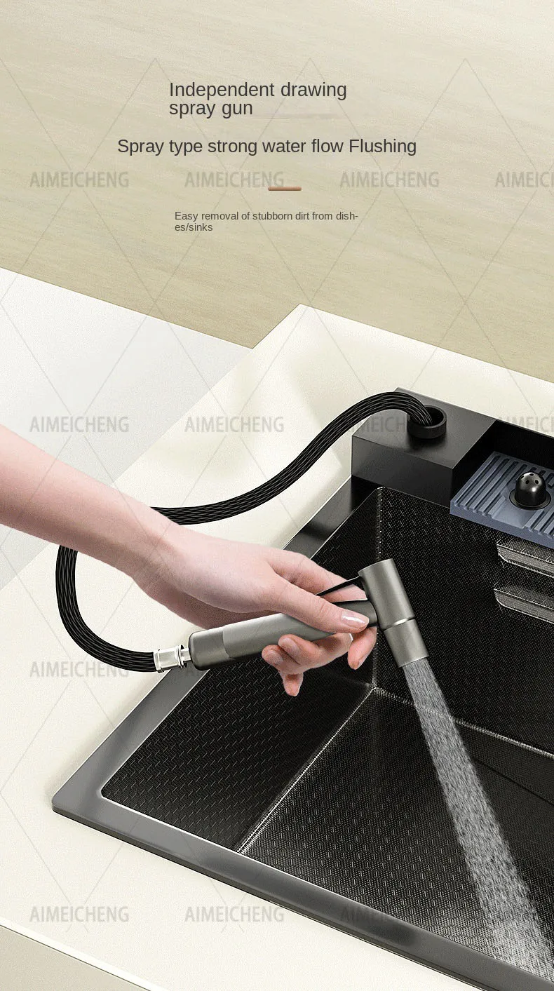 Digital fly rain waterfall sink embossed nano 304 stainless steel large single sink kitchen black washbasin