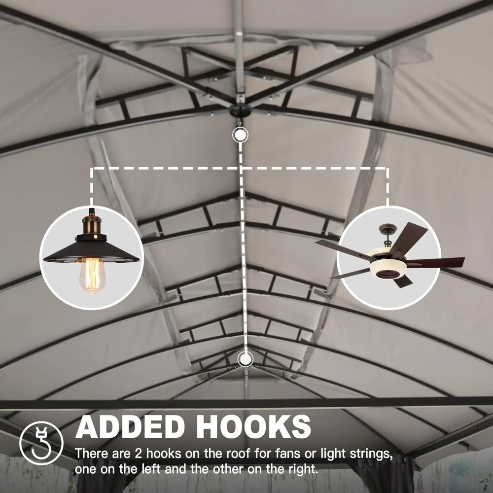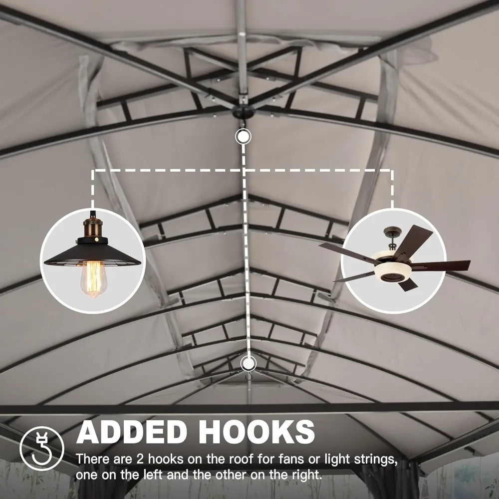- Ventilated Double-Roof-- The unique double-roof design of Domi gazebo enhances ventilation, keeping the interior cool and preventing heat buildup. Nettings between the tops act as a barrier against mosquitoes, perfect for outdoor events like parties and gatherings.