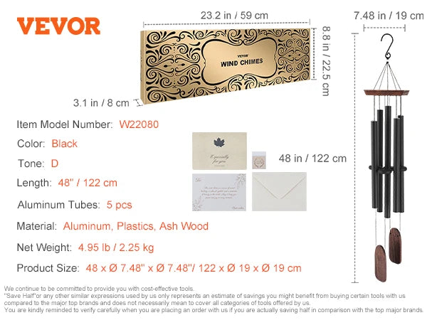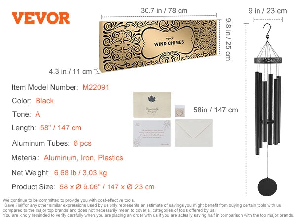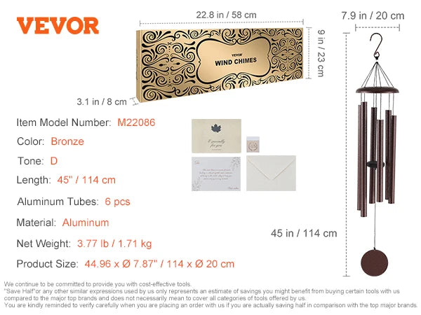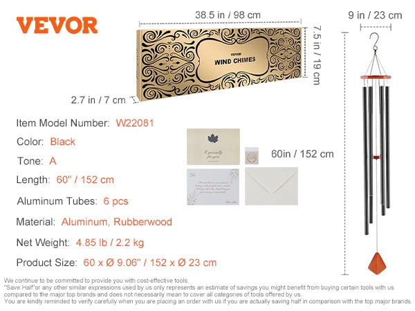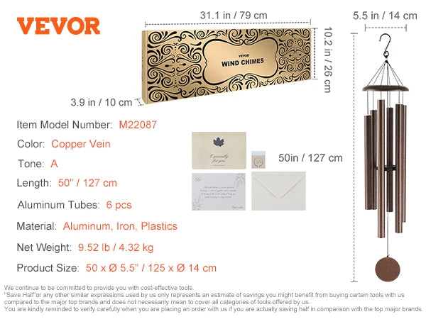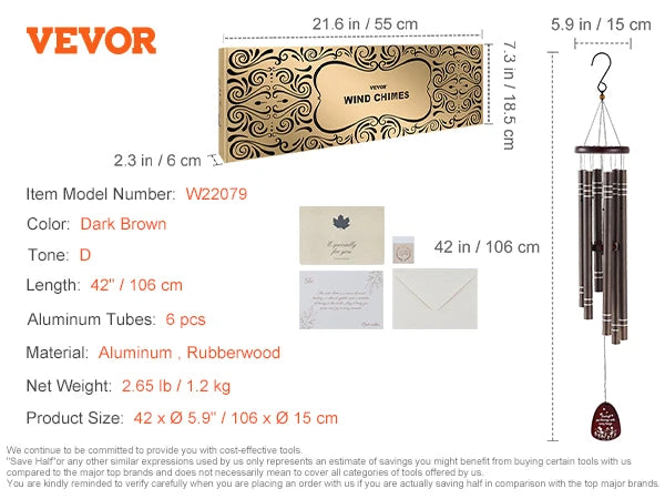 66-Inch Wind Chimes for Outside:Our bronze metal wind chimes have 6 aluminum tubes. The longest tube is 36.3" with a diameter of 1.49". The durable nylon cord and high-density clapper generate a pleasing, harmonious sound. It also comes with a postcard, greeting card, and envelope.
