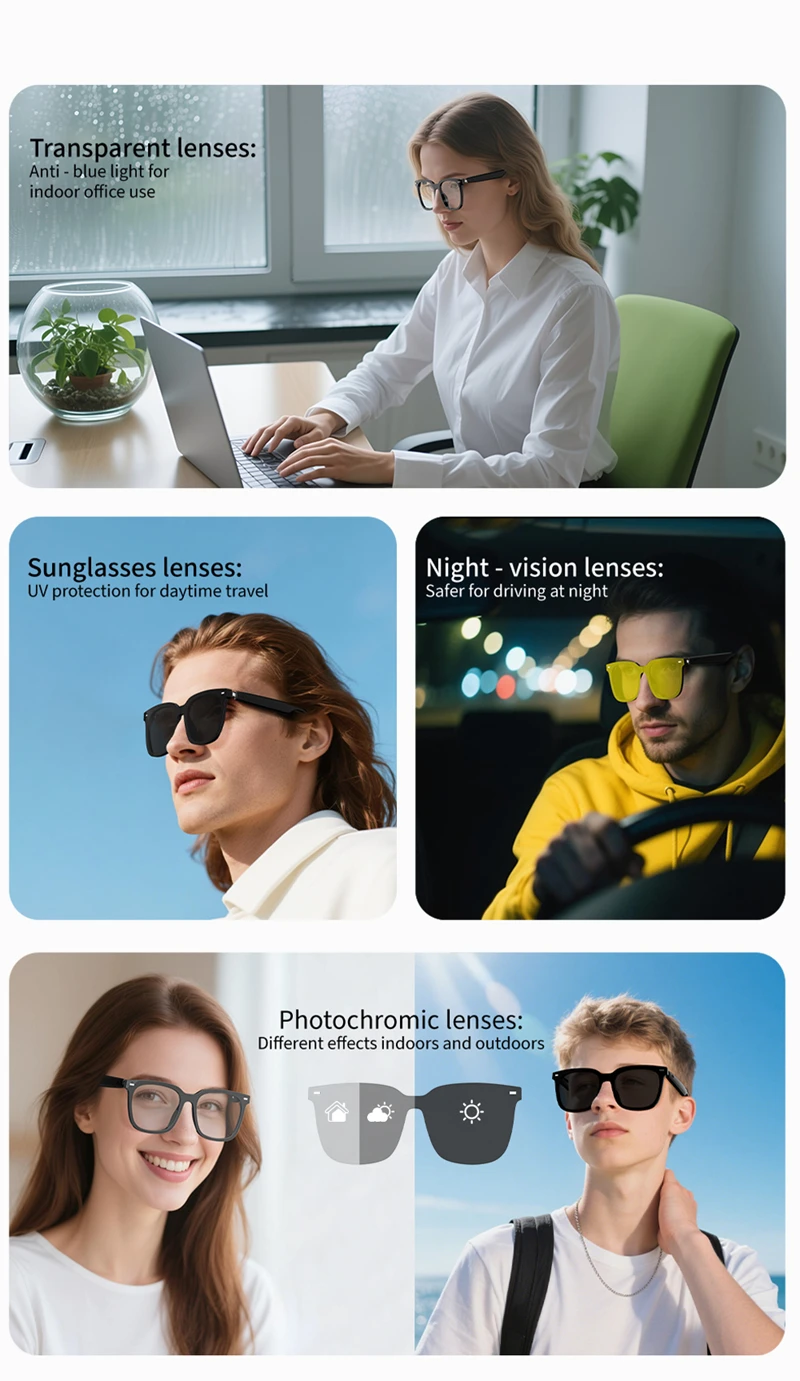 Function: Music,Voice Assistant,calling,Sun protection,Anti-blue light,AI translator,Chat gpt,Ai